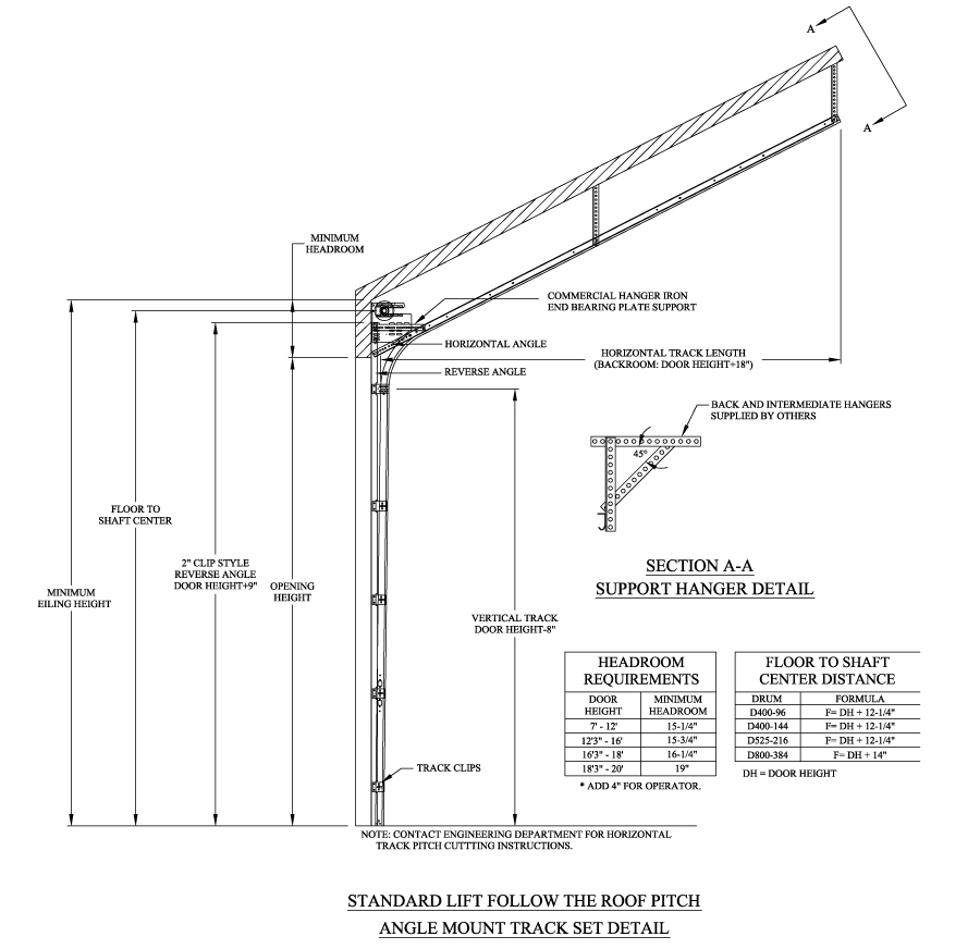 Modification of the high lift aligns track to follow the roof pitch line. It is recommended on buildings with roof pitches greater than 3:12. This option allows for maximum additional clearance under the track.